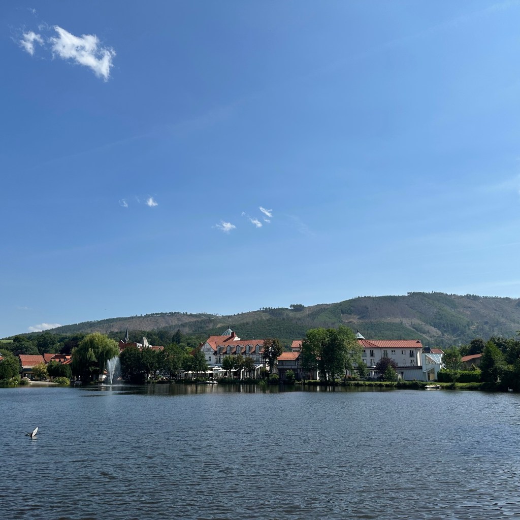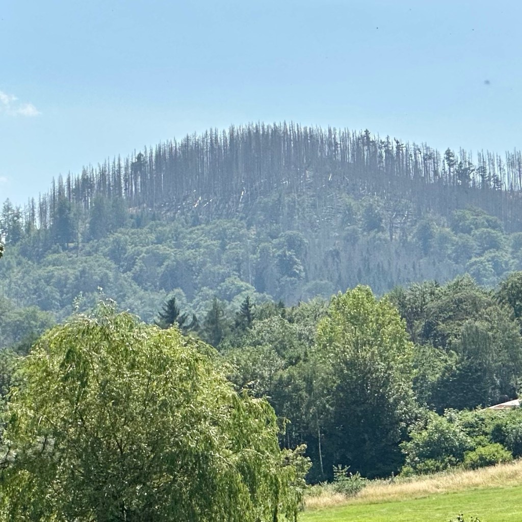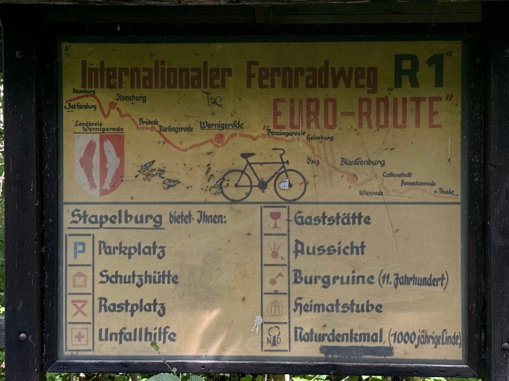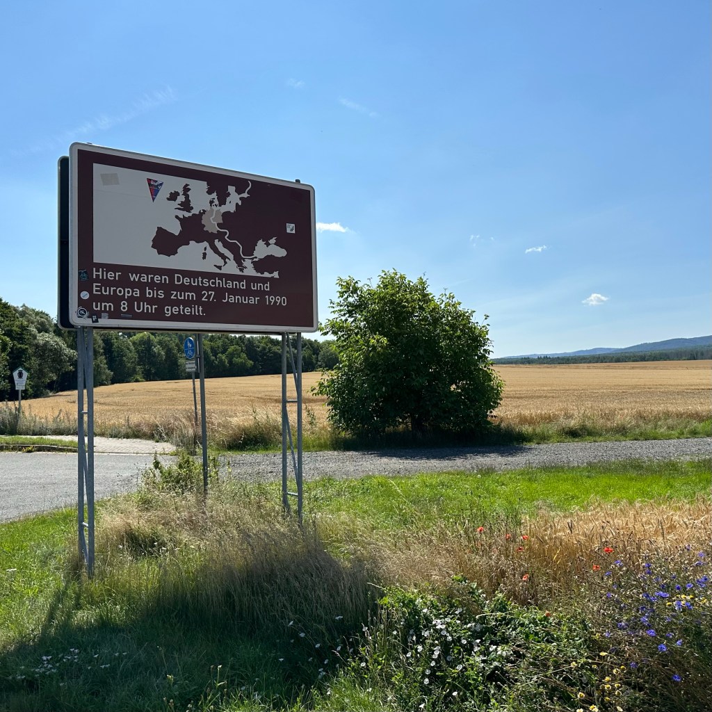 27. Januar 1990, 8 Uhr – dann öffnete sich hier die Grenze. Auf dem Harzer Grenzweg am Flüsschen Ecker, der streckenweise ein schmaler Patrouillenpfad ist, bewege ich mich zwischen West und Ost, der ehemaligen DDR und der ehemaligen BRD – wir mussten Letzteres in der Schule immer ausschreiben – den heutigen Bundesländern Niedersachsen und Sachsen-Anhalt, den Landkreisen Goslar und Harz, in der ehemaligen Sperrzone. An die Innerdeutsche Grenze, diesem Monstrum aus fünf Kilometer breitem Sperrgebiet, 500 m breitem ‚Schutzstreifen‘ und 10 m breitem Kontrollstreifen, würde heute, 33 Jahre nach Grenzöffnung kaum noch etwas erinnern. Die Zäune sind längst abgebaut, die Grenzpfähle wurden fachgerecht recycelt oder nach Mauerspechtmanier zerlegt und liegen jetzt in den Reliquienschreinen der Bevölkerung verwahrt. Ein Stück stummer Beton mit Farbrest. Die Natur hat den Todesstreifen in ein grünes Band verwandelt. Diese Grenze, ein nun hoffentlich fruchtbarerer Ort. Es würde kaum noch etwas an diese Zeit erinnern. Aber kein Weg ohne Hinweis oder Infotafel, die Auskunft darüber geben, wie es gewesen ist, was hier mal stand, was geschehen ist usw. Die Erkenntnis, dass mensch nur sieht, was mensch weiss, würde hier, im ‚geschichtslosen‘ Grün ansonsten arg auf die Probe gestellt. Aber klar, weiss auch ich was, ich habe die Grenzanlagen auf Fahrten nach Berlin und in die DDR oder vom Zug aus durch Hessen mit eigenen Augen gesehen. Und manchmal sind wir mit den Eltern im Harz nach Torfhaus oder Richtung Braunlage und haben rübergeguckt nach ‚Drüben‘. Aber Geschichte wird durch Gucken allein nicht lebendig. Es braucht Menschen, die einem davon erzählen, wie sie diese Zeit, das System, ihren Alltag erlebt und oft genug durchlitten haben. Und es braucht andere Menschen, die ihnen wirklich zuhören. An dem Dokumentationshäusschen auf dem Grenzweg vor Stapelburg gehe ich dann aber vorbei: Too much Information bei 32 Grad im Schatten. Überhaupt komme ich mir allmählich überinformiert vor. Kaum ein Baum, kein Pfahl, der mich nicht daran erinnert, auf welchem multioptionalen Weg ich mich gerade befinde: Fernwanderweg, Fernradweg, Harzer Grenzweg, Klosterwanderweg, Ilsenburger Stieg … auf die Via Romea werde ich erst wieder in Wernigerode stoßen. Von Kloster Wöltingerode an war ich diesmal nicht allein unterwegs. Ich hatte mir vorher ausgemalt, was für eine ‚Dynamik‘ das gäbe, eine andere Wandererin oder einen Wanderer vor der Nase zu haben. Aber es war erstaunlich sympathisch, streckenweise überholten wir uns, kamen miteinander ins Gespräch und gingen dann wieder unserer Wege. Über die jeweiligen Motive haben wir uns dabei nicht unterhalten, nur über das, was augenblicklich zählte.