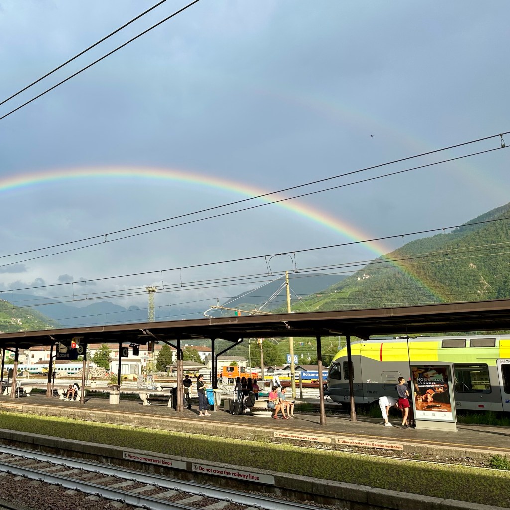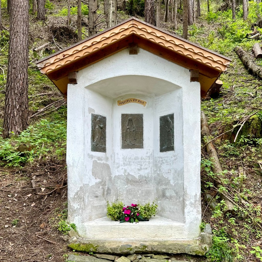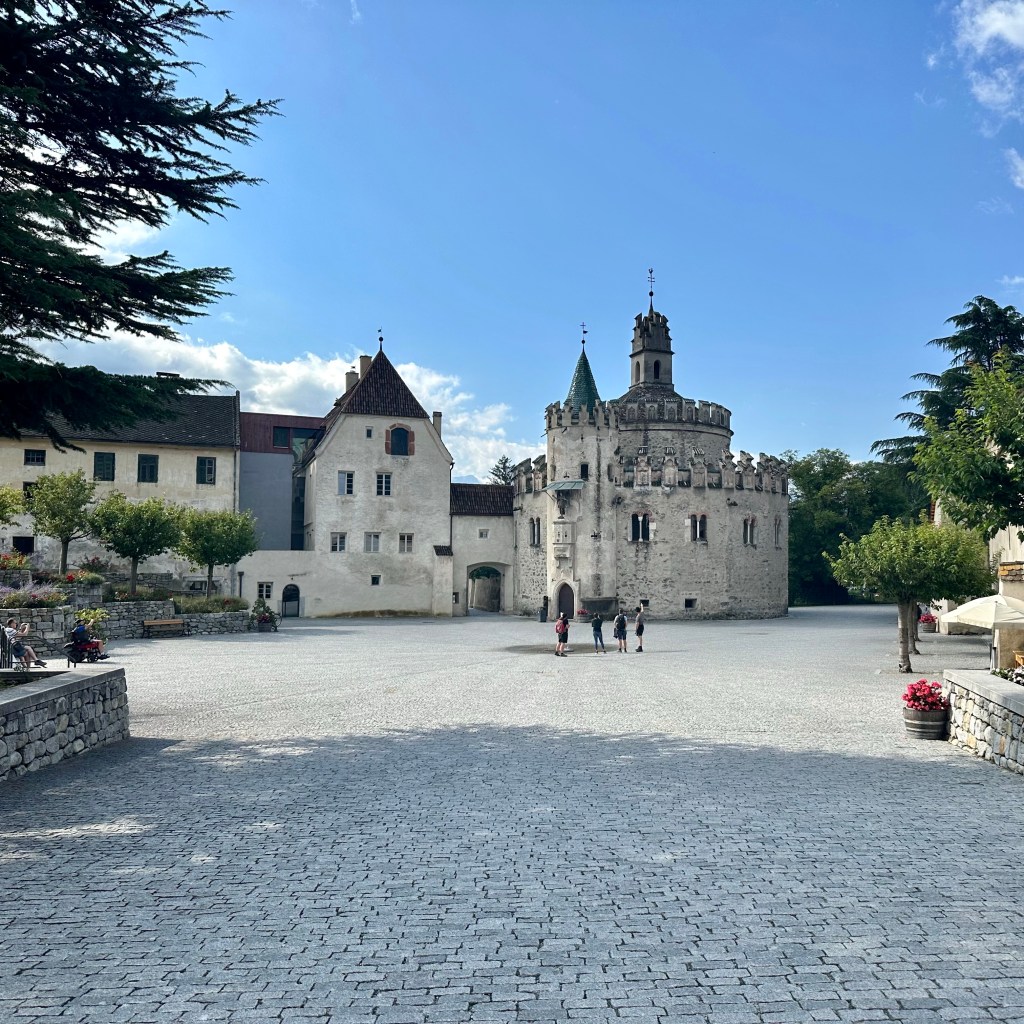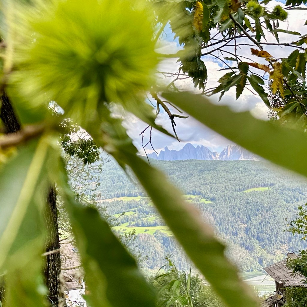 Bozen am Morgen. Sinniger Weise in der Lobby des Kolpinghauses, dessen Namensgeber sich im 19. Jahrhundert intensiv um die Soziale Frage, und hier besonders um die Bedingungen der Wandergesellen verdient gemacht hat. Entsprechend gibt es seitdem diese recht komfortablen Unterkünfte. Ein Wandergeselle bin ich nur in einem sehr weiten Sinne. Ich lerne nicht aus. Zwei meiner Urgroßväter, der eine damals als Braugeselle, der andere als Sattlergeselle, sollen es damals bis an die österreichische Grenze, der spätere Braumeister sogar bis nach Triest gebracht haben. Brixen und das wilde Eisacktal liegen längst hinter mir. Die Bilder werden folgen. Meine Wanderungen, manchmal auch nur ‚Exemplarische Spaziergänge‘, orientieren sich immer noch am Romweg Alberts. Ich nehme aber stark an, dass der gute Abt damals die Talstraße genommen hat. Warum sollte er sich mehr abplagen als nötig? Aber nicht nur dort, auch auf den steilen Hangstraßen ist es heute nicht mehr wirklich ratsam zu Fuß zu laufen. So bin ich denn gestern den steilen Hang über Brixen hoch und fand mich, tendenziell besinnungslos, auf dem ‚Europäischen Besinnungsweg‘ wieder. Alle 50 Meter lädt eine Station mit den Bildnissen ‚Europäischer‘ Heiliger, wie z. B. Augustinus, und biblischen Zitaten in den gängigsten Sprachen, zum Nachdenken ein. Eine schöne Idee, wären da nicht ich und der Hang … ich habe es dann bis zur ehemaligen Sommerresidenz der Brixener Bischöfe nach Feldthurns / Velturno geschafft, an uralten Esskastanien vorbei, die schroffen Dolomiten im Blick. Dann hinunter nach Klausen / Chiusa – wenn einer so will, auf einer motorisierten Sänfte … heute soll es weiter nach Tramin gehen, dann bis zur Salurner Klause.