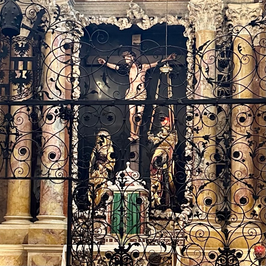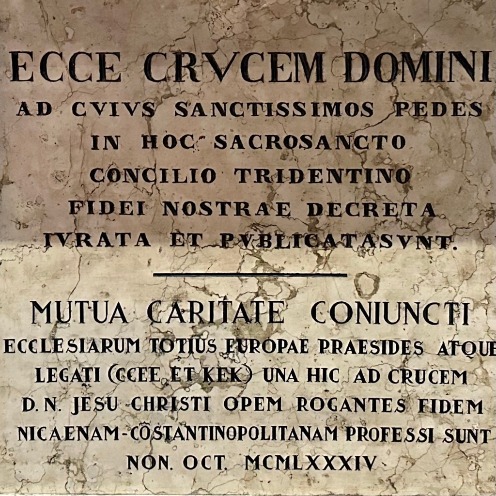 Wenn ein Protestant in Trient die lokale Spezialität ‚Strangolapreti‘ bestellt, deutsch ‚Priesterwürger‘, ist dies natürlich nur sehr symbolisch und eher scherzhaft als Reaktion auf das Tridentinum, das Konzil von Trient (1545 – 1563), das die römisch-katholische Kirche reformieren und die sogenannte ‚Gegenreformation‘ einleiten sollte, zu verstehen. Luther hatte solch ein Reformkonzil immer angemahnt. Er starb darüber hinweg. Das konfessionelle ‚Tischtuch‘ war längst zerschnitten. Am römischen Tisch ließen es sich die Konzilsteilnehmer bei den in reichlich Butter geschwenkten Knödeln gutgehn, heisst es. Unter dem gekreuzigten Christus, flankiert von Maria und Johannes, im Dom von Trento / Trient wurden die Beschlüsse nach 18 Jahren und 25 Sitzungen schließlich verkündet und rechtskräftig. Die Kapelle gehört immer noch zu den meist besuchten Orten im Gotteshaus. Weder kann ich behaupten, dass die Drei der Kreuzigungsgruppe besonders glücklich dreinschauen, noch geht es mir besonders gut an diesem Ort. Aber die Strangolapreti in Vela, jenseits der Etsch, sind vor allem eines: überkonfessionell lecker! Am Sonntag geht es weiter ins Valsugana nach Levico Terme.