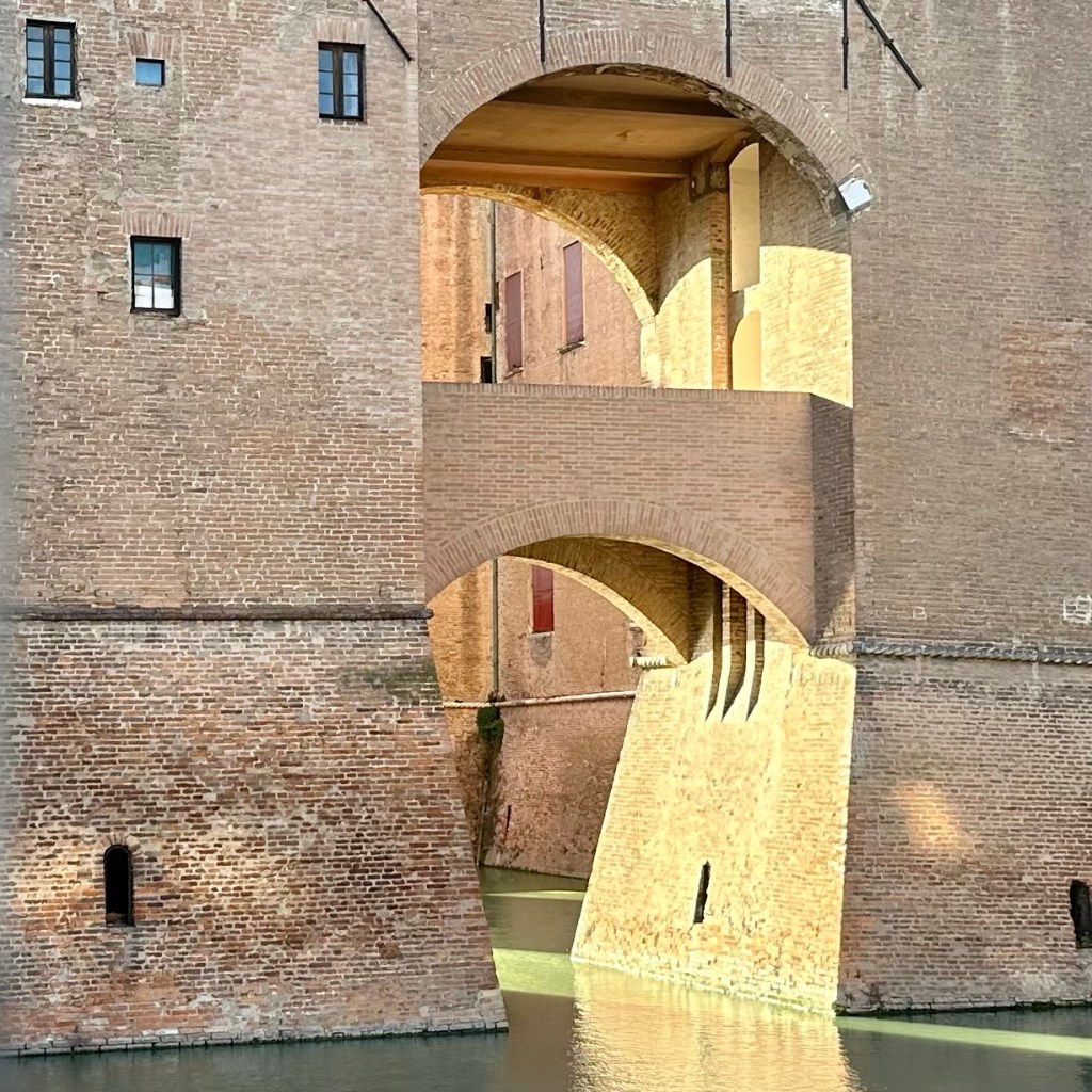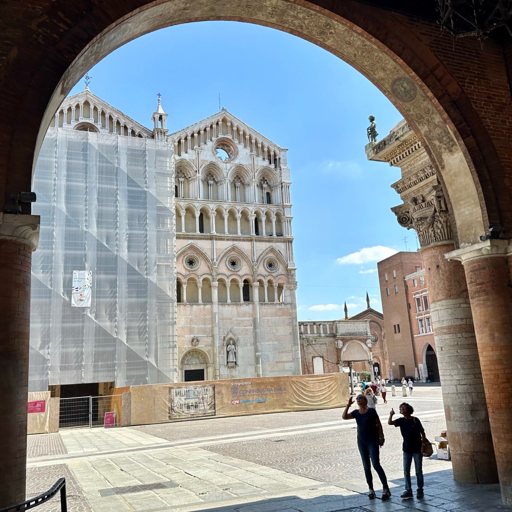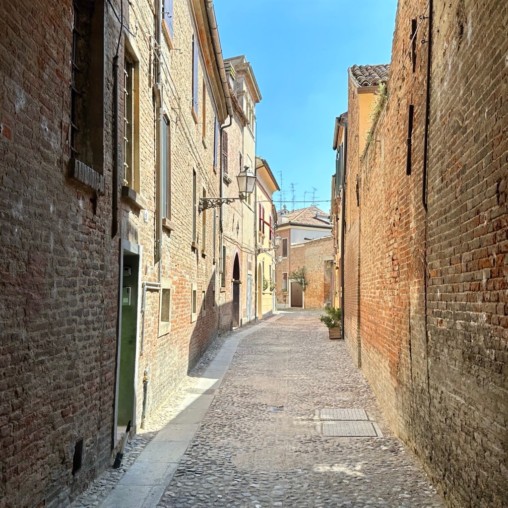 Auf den ersten Blick wirkt die Stadt wie eine triste Vorstadt, die sich das Zentrum erobert hat. Ferrara trägt einen etwas angegrauten Schleier. Erst die Abendsonne taucht alles in ein gnädiges Licht. Aber die Großstadt, die irgendwie keine sein will, ist gut durchdacht. Ein regelmäßiges Netz von Straßen und Gassen, Längs- und Querverbindungen sorgt dafür, dass alles im Blick bleibt und erreichbar ist. Wer das Prinzip eines der ältesten modernen Stadtplanungen der Welt verstanden hat, wird sich hier niemals mehr verlaufen. Eine sympathische Stadt, die weitgehend unprätentiös, fast schon verschwiegen daherkommt. Das liegt sicherlich auch an der Hitze, die den Touristen gehört. Aber so verschwiegen auch wieder nicht. Das Castello Estense, die wehrhafte Burg der einstigen Herrscherfamilie der D’Estes im Zentrum Ferraras ist ein deutliches Statement. Dagegen wirkt der Dom recht bescheiden. Ferrara ist seit der Zeit der D‘Estes ein Ort der Kultur. Und der Toleranz, mit bitteren Unterbrechungen. Hier fanden spanische Juden, die infolge der ‚Reconquista‘ 1492 vertrieben wurden, eine neue Existenz. Bis die D‘Estes keinen männlichen Nachfolger mehr vorweisen konnten und Ferrara Ende des 16. Jahrhundert unter päpstliche Gewalt fiel und Juden, wenn sie nicht schon ausgewandert waren, im Ghetto leben mussten und entrechtet wurden. Die Geschichte der Juden auf dem Gebiet des heutigen Italiens, seit der Zerstörung des Jerusalemer Tempels 70 n. Chr. bis zur Shoah, dokumentiert das hervorragende Museo Nazionale dell’Ebraismo Italiano e della Shoah, kurz MELS https://meis.museum/ – Ferrara lohnte ein paar Tage mehr. Aber nun sitze ich schon im Regionalzug und fahre durch die Emilia-Romagna Richtung Ravenna. Gut klimatisiert. Die Landschaft ist flach. Der Boden fruchtbar. Und monotone Situationen fördern ja die Meditation beim Gang durch die Botanik. Aber nicht bei 32 Grad im Schatten – ohne Schatten.