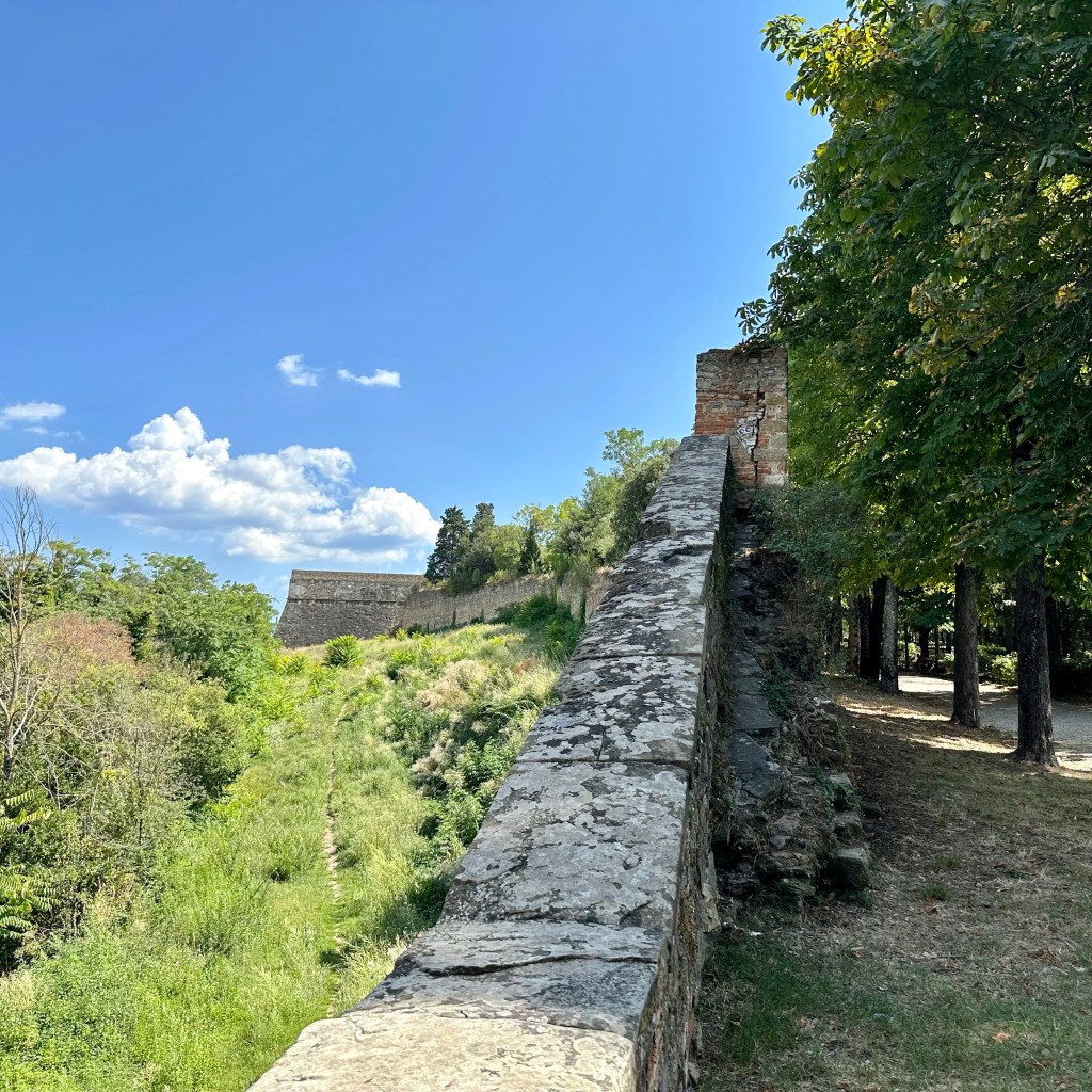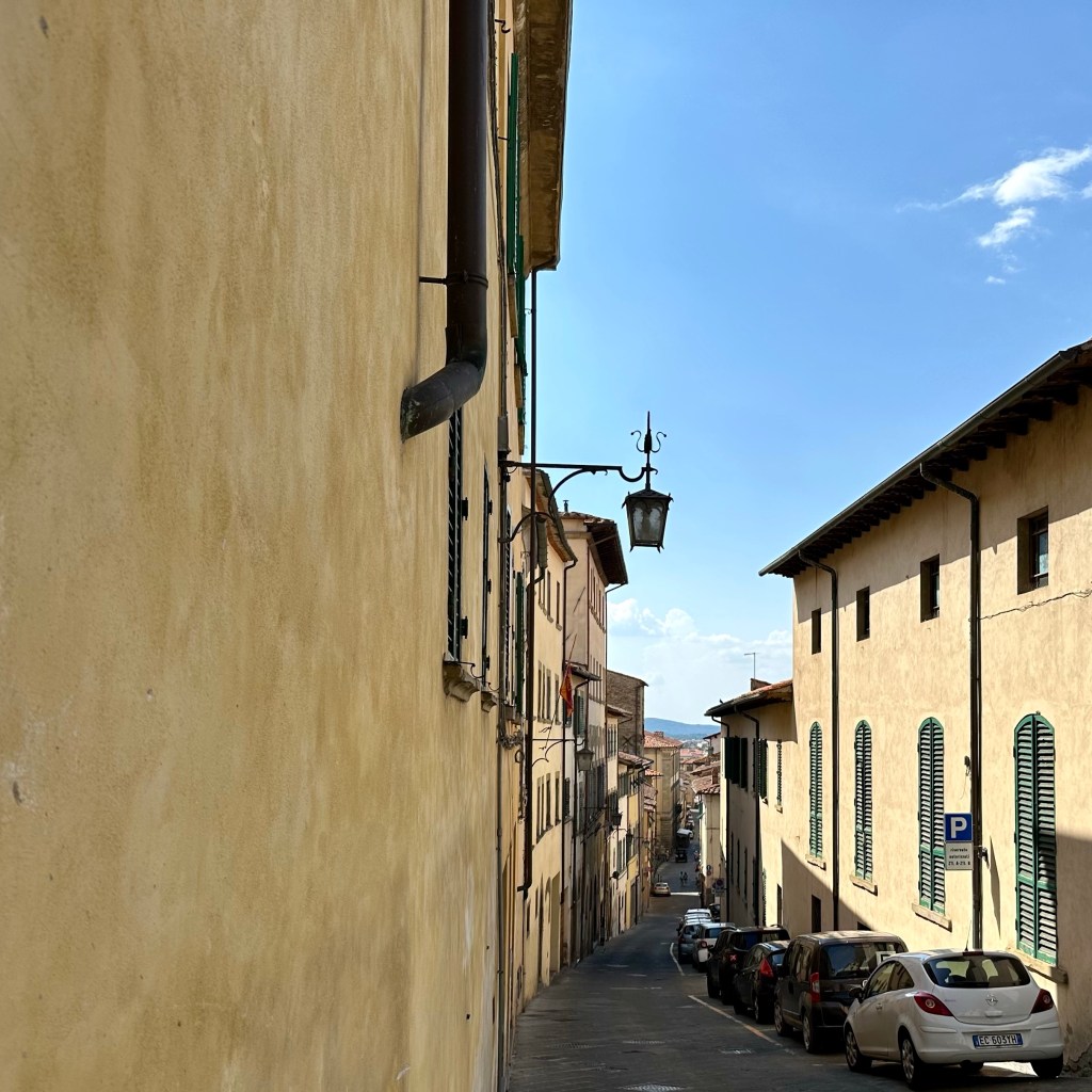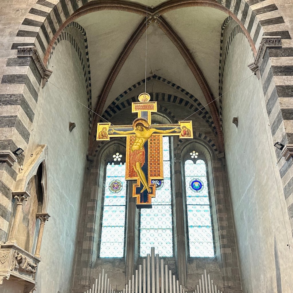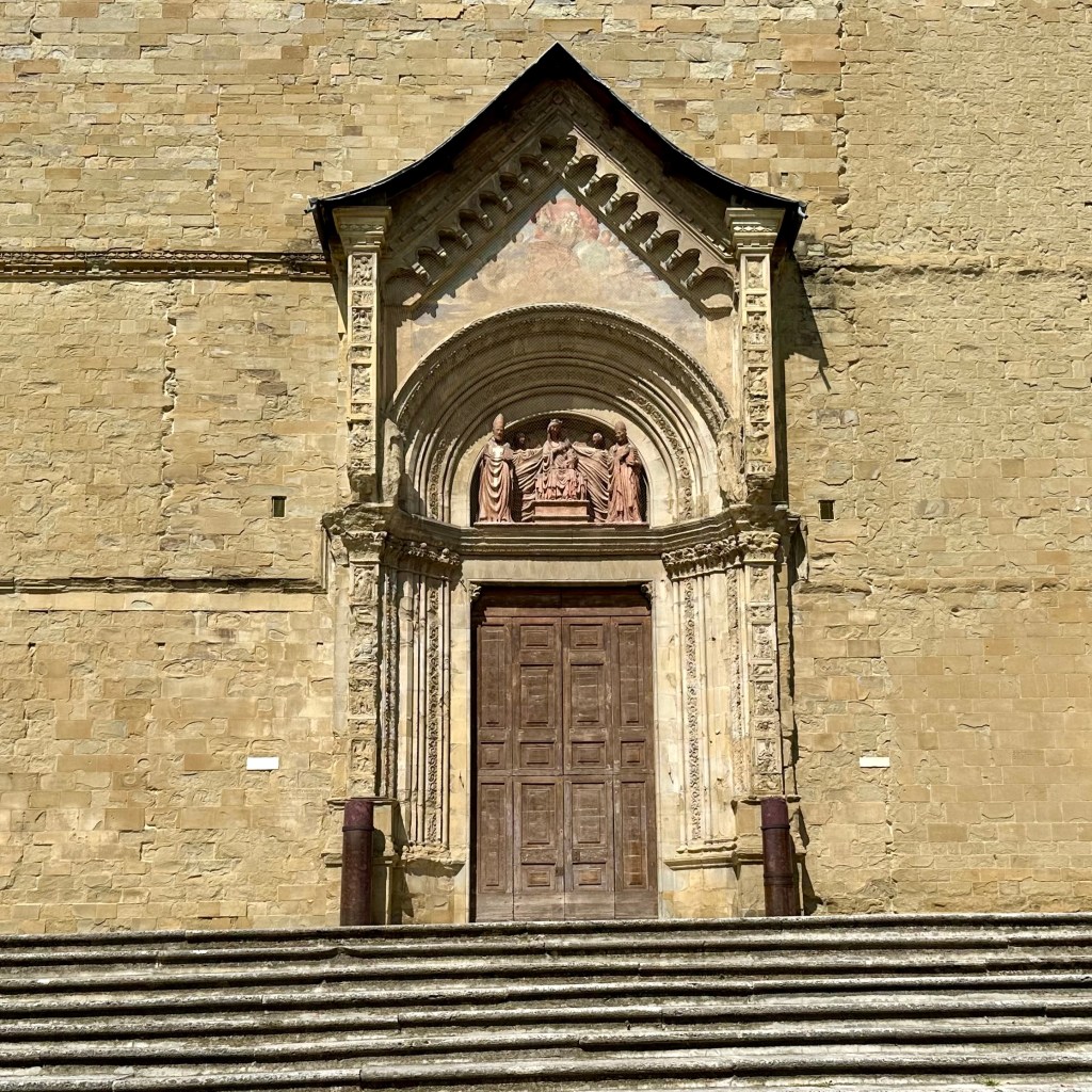 Der Weg vom beschaulichen Kurort Bagno di Romagna nach Arezzo liegt hinter mir. Und ich kann mir nur annähernd ausmalen, wie strapaziös diese Passage für einen Reisenden im 13. Jahrhundert gewesen sein muss, zu jeder Jahreszeit. Für mich Busreisenden war dies schon abenteuerlich genug. Aber die Fahrerin und die beiden späteren Fahrer nahmen alle engen Kurven und abschüssigen Straßen mit erfahrener Lässigkeit. Bis wir nach dem breiten und aufgeheizten Tibertal endlich Arezzo erreichten. Und jetzt die Toskana, altes etruskisches Kulturland. Auch für denjenigen, der sich nicht um ein Kulturticket kümmert, gibt es noch genug zu sehen. Das berühmte Kruzifix Cenni de Pepos oder ‚Cimabues‘ in der Chiesa di San Domenico möchte ich mir heute anschauen. Albert von Stade mag davor gebetet haben. Immerhin gab es am Abend ein bisschen Regen, aber keine Abkühlung. Und es hat kaum einen Vorteil, bei Sonnenaufgang aufzubrechen, denn es ist generell heiß. Ich will heute meinen ‚öffentlichen‘ Weg, zumindest an der Via Romea entlang fortsetzen, zunächst nach Castiglion Fiorentino, dann nach Cortona.