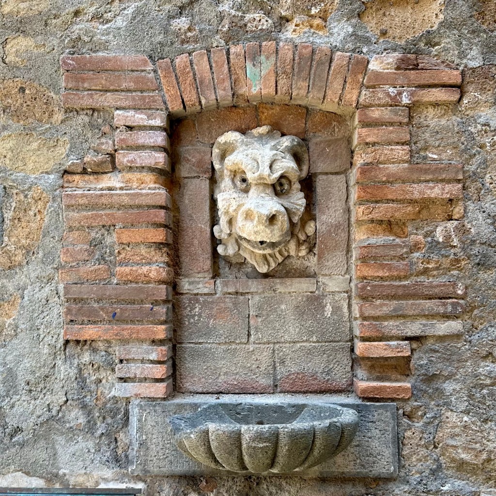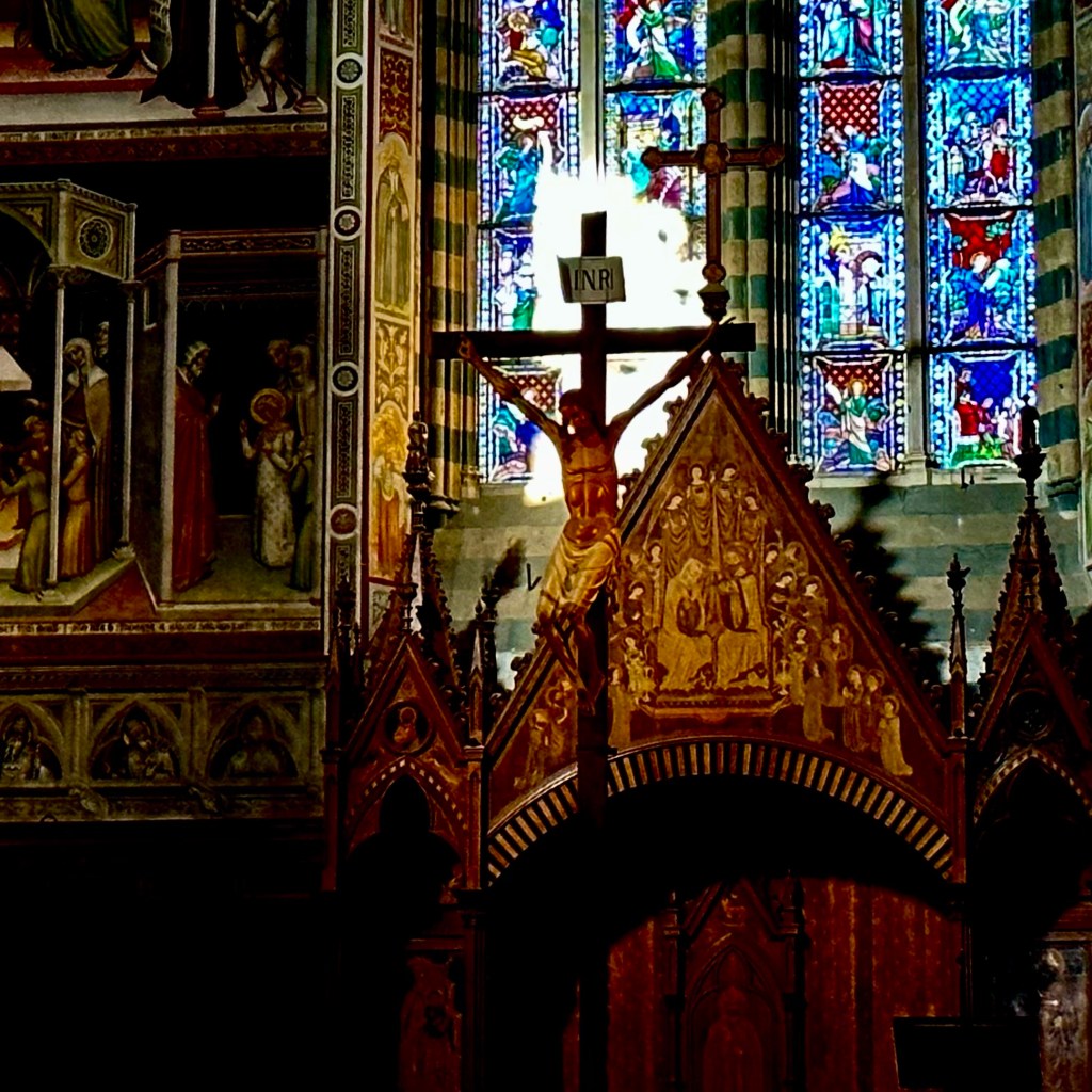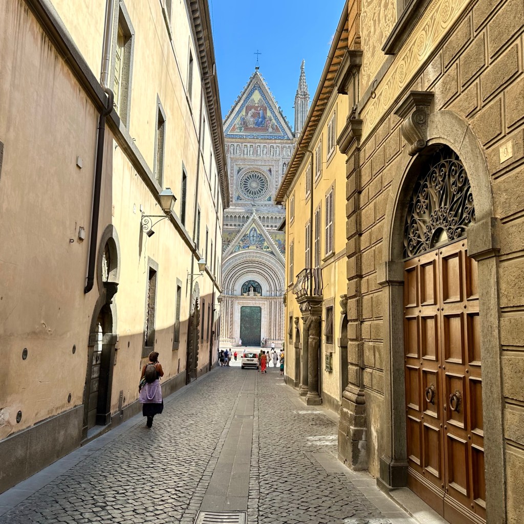 Das Hirn ist schon ein besonderes Mysterium. Und darin das Sprachzentrum. Dem Mitgast, dem ich eben im Garten von Orvieto ein freundliches ‚Bonjour‘ zurufe, war vielleicht für einen Moment irritiert. Aber ich musste mich erst einmal selbst orientieren und etwas Sinnvolles von mir geben. Warum also nicht auf Französisch?! Es ist noch früh am Morgen, aber gleich gibt es Kaffee. Eine Orientierung besonderer und grundsätzlicher Art erlebte ich gestern auf dem Gang um die Stadt, vor allem aber im Dom von Orvieto. Was für ein Gotteshaus! Die zwölf monumentalen Apostelfiguren und vier weitere Heilige weisen dem Gläubigen den Weg in das Mysterium des Glaubens. Dieses gewaltige Bauwerk, an dem die verschiedensten und besten Meister ihres Fachs, u. a. Fra Angelico, gewirkt haben, verdankt seine Existenz letztlich dem Zweifel eines böhmischen Geistlichen, einem Pilger, an der Transubstantiationslehre. Das heißt, der Lehre von der vollkommenen Wandlung von Brot und Wein bei der Eucharistie in den wahren Leib und das wahre Blut Jesu Christi und seiner bleibenden Gegenwart. Ein ‚Thomas‘ also, der in Bolsena 1263, erleben musste, wie beim Brechen des Brotes bei der Abendmahlsfeier, Blut aus der Hostie strömte, und zwar so reichlich, dass ein Altartuch, das ‚Korporale‘, damit durchtränkt wurde. Dieses Tuch mit dem Blut Jesu Christi, so zumindest die fromme Überzeugung, wird heute noch in der Seitenkapelle des Doms präsentiert und verehrt. Das Wunder aber wurde bald darauf vom damaligen Papst Urban IV. bestätigt und der heilige ‚Beweis‘ nach Orvieto geholt. Daraus entstand letztlich das Fronleichnamsfest, das die römisch-katholische Kirche in jedem Sommer, 60 Tage nach Ostern, mit Gottesdiensten und Prozessionen feierlich begeht. Es gibt wohl keinen Tag, der so programmatisch aufgeladen und die Kontroverse zwischen Katholiken und Protestanten so deutlich markiert hat, wie dieser Tag. Von den protestantischen Mistfuhren auf den Prozessionsrouten nicht zu schweigen. Dies hat sich sicherlich gewandelt. Luther kritisierte an dem Fest die päpstliche, jeder biblischen Begründung entbehrende, Bemächtigung des ‚Themas’, das eigentlich am Gründonnerstag seinen Sitz habe, wenn es denn um den Tag ginge. Abgesehen vom sicherlich immer mal wieder sehr volkstümlichen Prozessionstreiben. Wie auch immer: Der Glaube baut Gott Häuser wie dieses. Und manchmal haben sich wohl auch politisches Kalkül oder die Furcht vor der ewigen Verdammnis untergemischt. Ich bin einige Zeit in der Basilika geblieben und habe mich gefragt, was von den vielen ‚Botschaften‘ dieses Kirchraums heute noch beim Besucher oder bei der Besucherin ankommt. Bei aller Fülle, im Zentrum des Altarraumes ist auch hier das Kreuz aufgerichtet, so einfach wie anrührend gehalten, dass es in dieses opulente Setting nicht zu passen scheint. Die Frage ist: Ist dies der ‚Schlüssel‘ zum Verständnis des gesamten Raumes und seines Inventars? Der Raum jedenfalls wird besucht und bestaunt, vermutlich weitgehend unbekümmert von den Fragen nach den letzten Dingen. Die mächtigen Bronzetüren sind aufgeheizt von der Mittagssonne, nicht vom Höllenfeuer diesseits des heiligen Raumes? – Heute soll es später ins ‚Museo Archeologico Nazionale di Orvieto’ mit weiteren Zeugnissen etruskischer Kultur und zu dem architektonischen Meisterwerk, dem Brunnen ‚Pozzo di San Patrizio‘ des Antonio da Sangallo aus dem 16. Jahrhundert gehen.