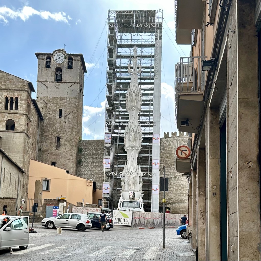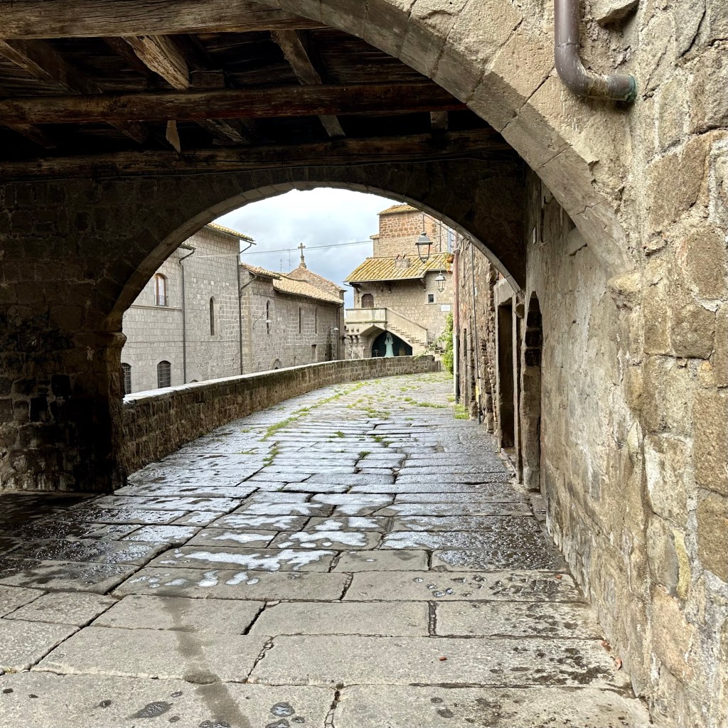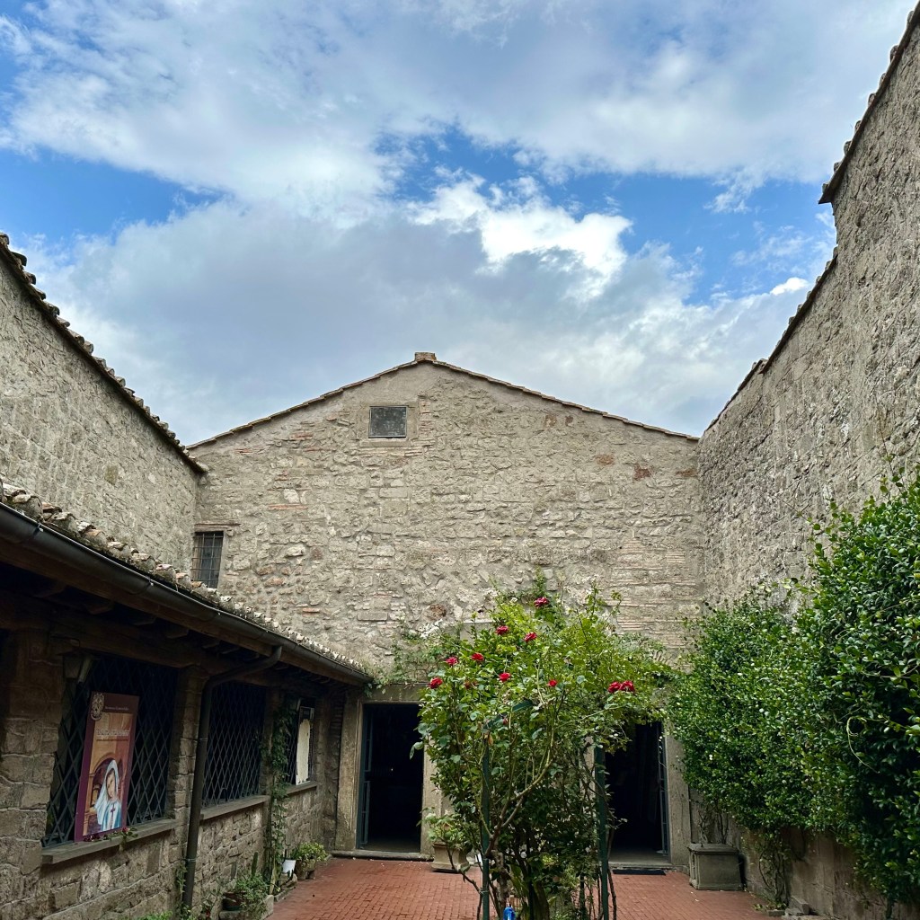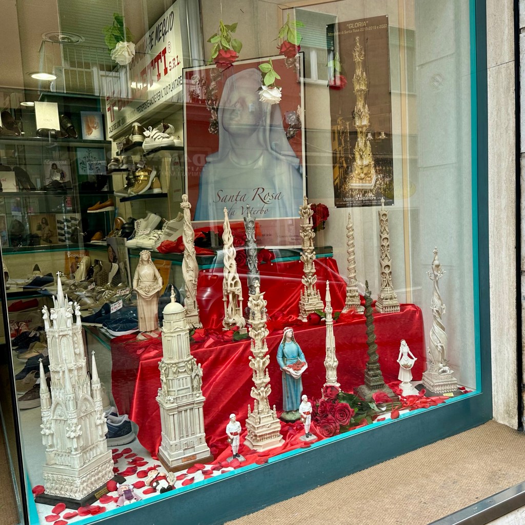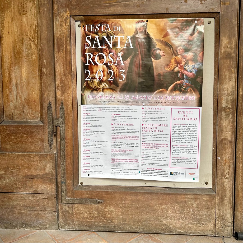Es muss die ganze Nacht hindurch geregnet haben, und es regnet noch. Und es ist merklich frischer geworden. Eichen im Nebel. Ob ich den Weg nach Sutri durch Eichenwald und Haselstrauch zu Fuß antreten werde, werde ich sehen. Gestern, als ich am Abend nach einem langen Weg durch Vetralla zurückkehrte, wurde ich am Waldrand, an dem meine Herberge liegt, schon mit einem tiefen, nicht wirklich freundlichen Warngrunzen von einem Wildschwein begrüßt. Ihm mag heute der Wald gehören. Vetralla liegt im vulkanisch geprägten Hügelland des südlichen Tusciens. Viterbo habe ich mir gestern noch ein bisschen näher angeschaut. Als ‚Stadt der Päpste‘ wird sie beworben, und ihre Präsenz im 13. Jahrhundert lässt sich heute noch gut an den erhaltenen, oder nach den Zerstörungen des 2. Weltkriegs rekonstruierten, Palästen im Stadtbild ablesen. Wer einen Film über das Mittelalter des 13. oder 14. Jahrhundert drehen wollte, fände hier reichlich Kulisse, inklusive mächtiger ‚Geschlechtertürme‘, Pilgerherbergen und Gassen, bei dem einer jederzeit damit rechnet, dass William von Baskerville aus dem ‚Namen der Rose‘ auf einem Maulesel um die Ecke kommt. Hier suchte die päpstliche Kurie nicht nur Schutz vor den römischen Adelsfamilien, hier haben sie auch einen Papst gewählt, im bisher längsten Konklave der Geschichte. Ganze 1005 Tage, vom 30. November 1268 bis zum 1. September 1271, soll es bis zur Wahl von Papst Gregor X. gebraucht haben. Zuletzt empfahl Bonaventura, die Kardinäle auf Wasser und Brot zu setzen. Das half. ‚A closed Society, like a Monastery‘ sei Viterbo bis heute. Ich treffe in der ‚Casa di Santa Rosa‘ auf Pietro, einem ‚Pathfinder and Hiking Guide‘, der Pilgerinnen und Pilger aus aller Welt auf der Via Francigena begleitet. Wer der Gesellschaft von Viterbo ‚ins Herz‘ schauen möchte, muss wohl das Wohnhaus und das anliegende Kloster, das sich heute dem Gedächtnis Santa Rosas, der Patronin Viterbos, verschrieben hat, aufsuchen. Hier wird die jung verstorbene Frau aus dem 13. Jahrhundert bis auf den heutigen Tag als Schutzheilige junger Mädchen verehrt. In einem großen Saal ist ihr mumifizierter Leichnam aufgebahrt. Dass sie bald zur Volksheiligen erklärt wurde, liegt vermutlich in einer Mischung aus tiefer Frömmigkeit und politischer Zweckmäßigkeit in unsicheren Zeiten begründet. Mit ihrem klaren Bekenntnis zum Papst und gegen die zeitweise starke Bewegung der Katharer, vor allem gegen den zu ihrer Zeit bereits als ketzerisch verdammten römisch-deutschen Kaiser Friedrich II, war sie als Symbolfigur willkommen. Seit dem 17. Jahrhundert wird zu Ehren der Hl. Rosa jährlich die ‚Macchina di Santa Rosa‘, ein 28 Meter hoher und fünf Tonnen schwerer Turm, mittlerweile aus Aluminium, Glasfaser und weiteren leichteren und feuerfesten Materialien gebaut. Und dann am Abend von der Gemeinschaft der ‚Facchini’ von der Porta Romana bis zur Chiesa di Santa Rosa getragen. Das Mega-Ereignis wird im Fernsehen live gesendet. Mit der Strecke wird an die päpstlich angeordnete Überführung der Heiligen nach ihrem Tod in das Kloster der Klarissen erinnert. Denn die Franziskanerinnen, zu denen Rosa einst gehören wollte, hatten Rosa drei Mal abgelehnt. Die diesjährige ‚Macchina‘ steht schon bereit, und die Männer, die dieses Gewicht stemmen wollen, bereiten sich vermutlich schon den ganzen Sommer in den Muckibuden Viterbos darauf vor. Draußen kündigt dichter Nebel das Ende des Sommers an. Ich werde jetzt meinen ‚Zaino‘, meinen Rucksack packen und vergleichsweise unbeschwert zur Station traben, Fahrziel Station Capranica-Sutri, dann zumindest den Teil des Weges ohne Wald nach Sutri.
