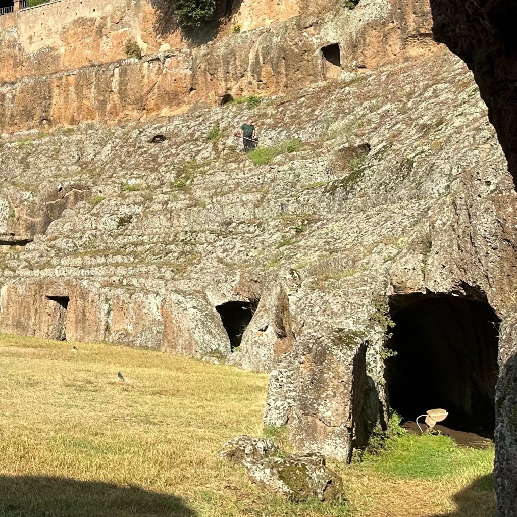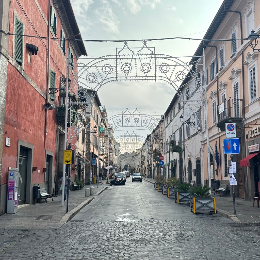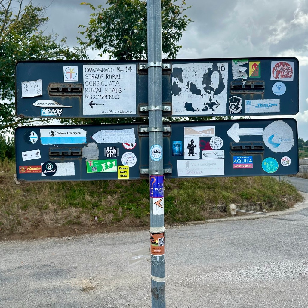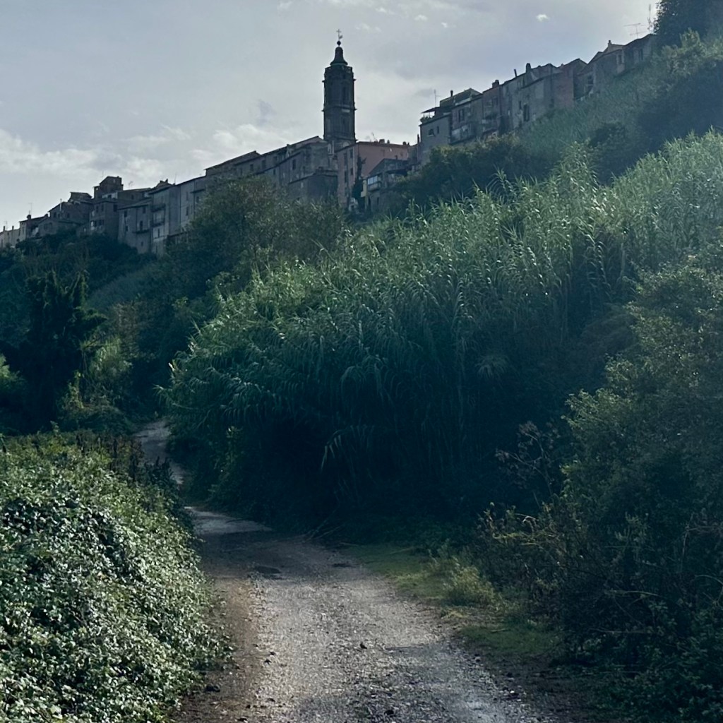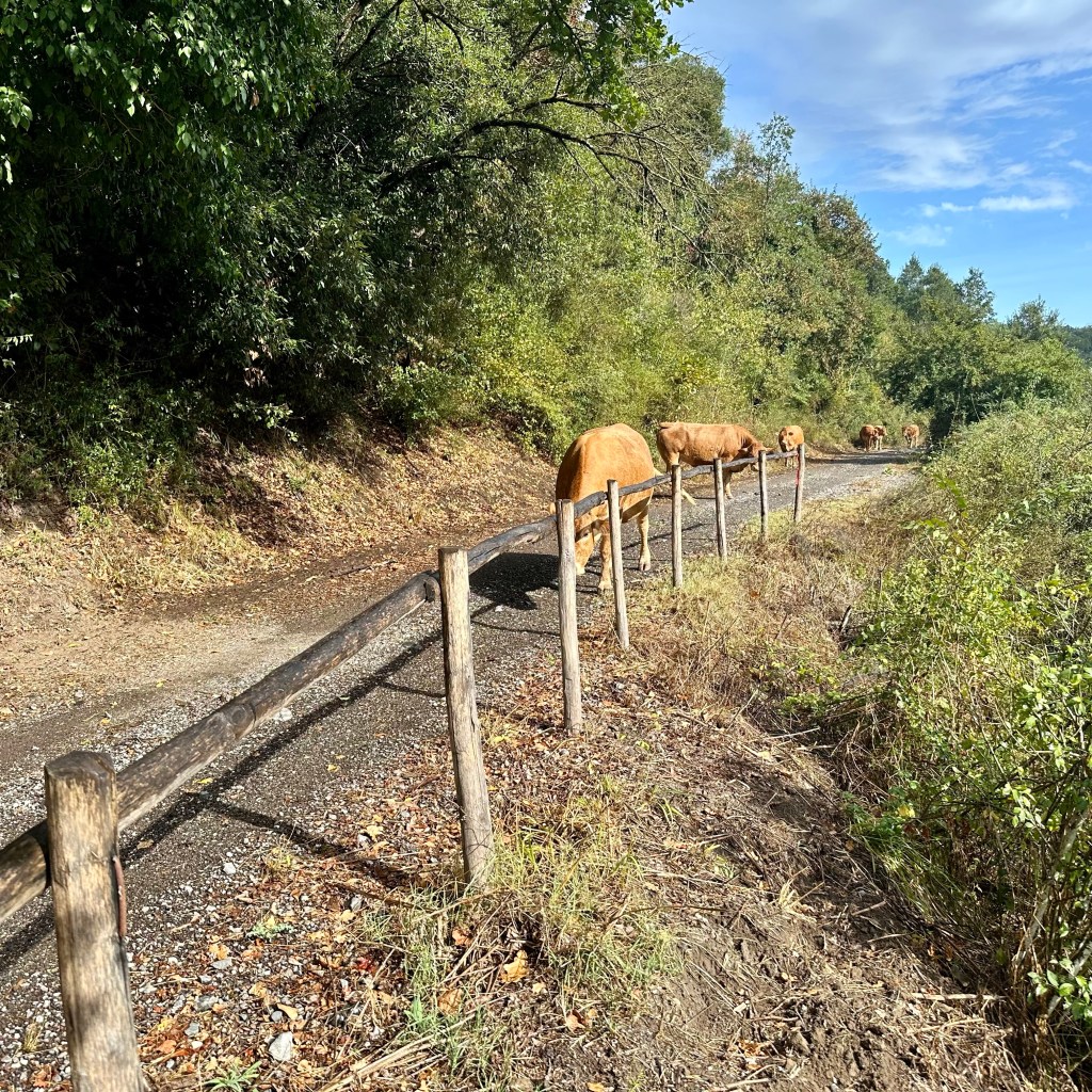 Gleich vierfach wurde ich bei meinem Eintreffen in Campagnano di Roma begrüßt: Von einem heftigen Regenguss, einer Herde sich weitgehend frei organisierender Kühe mit einem aufmerksamen Jungbullen und zwei Hähnen, die noch am späten Nachmittag um die Wette krähten. Das Grunzen des Wildschweins im Dickicht unterhalb der hoch gebauten Stadt klang zwar eher nach einer Warnung. Aber ich will das mal als Begrüßung gelten lassen. Ansonsten Stille über dem Veio-Park, dem Naturschutzgebiet, das einen tief unter der urbanen Klippe vergessen lässt, bereits mitten in der Metropolitanregion Roms zu sein. Nicht einmal eine Glocke, die dem Ort den Namen gab. Oben angekommen: Jungs, die auf der kleinen Piazza des Viertels kickten. Mütter, die ihre ‚Bambini’ ständig ermahnten und auf den ‚Signore‘, der da ein bisschen erschöpft auf der Bank saß, hinwiesen. Ich wollte der Fußballkarriere des Dreamteams dann nicht weiter im Weg sitzen und setzte meinen Weg bald wieder fort. Erst am Ende der Gasse kam nach und nach die Stadt in Gang. Der Corso Vittorio Emanuele war noch festlich geschmückt für die Festa zu Ehren der Stadtheiligen San Giovanni Battista und San Celestino Martire die Tage zuvor. Am Abend im Gasthaus gleich zur Pasta Regierungschefin Giorgia Meloni omnipräsent im TV, kommentiert von einer Gruppe Männer in den besten Jahren, vermutlich eher Sympathisanten, denn geschimpft wurde wenig. Vielleicht ging es um ihre Steuerpläne, die weitere Leugnung der Klimakrise oder die abgründigen Äußerungen ihres Mannes zur Gewalt gegen Frauen. Hier hätten bessere Italienischkenntnisse geholfen, aber es wäre auch so schwer genug gewesen, den rasanten Wortwechseln zu folgen. Auf dem Weg durch die Botanik ist die Tagespolitik oft sehr weit entfernt. Das heißt aber nicht, dass der Gang durch die Kulturlandschaften unpolitisch sei. Alles, was in unserer Gesellschaft falsch – aber eben auch, was zukunftsweisend ist – kommt oder fährt einem auch dort über den Weg. Wenn es denn ein Pilgerweg sein soll, führt er gerade bewusst in die Welt hinein, d. h. von sich selbst fort zu den Menschen. Heute soll es noch einmal eine längere Strecke von Campagnano di Roma über Isola Farnese nach Olgiata gehen.